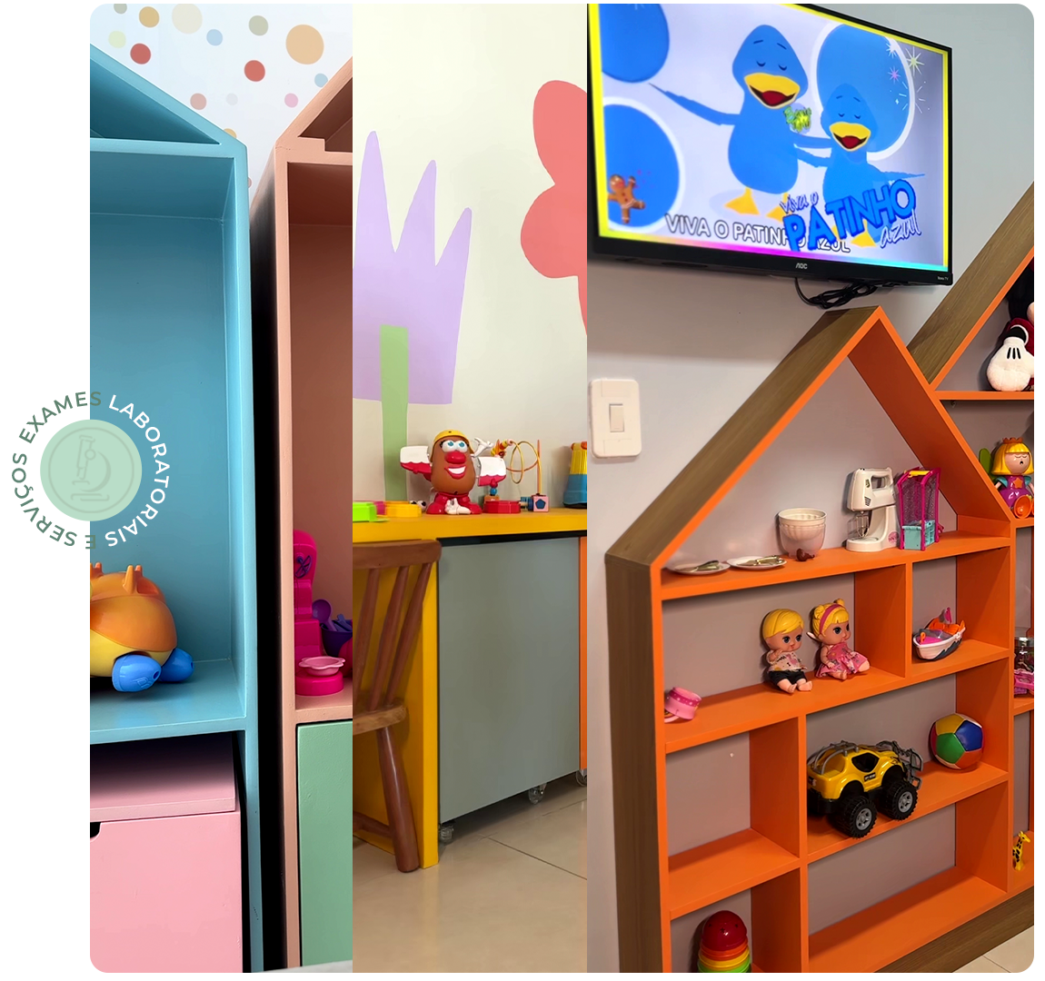 Sabemos que exames e consultas podem gerar ansiedade, principalmente nas crianças. Por isso, criamos um ambiente lúdico, colorido e acolhedor, com brinquedos, desenhos e atividades que ajudam a tornar o momento mais leve e tranquilo.
